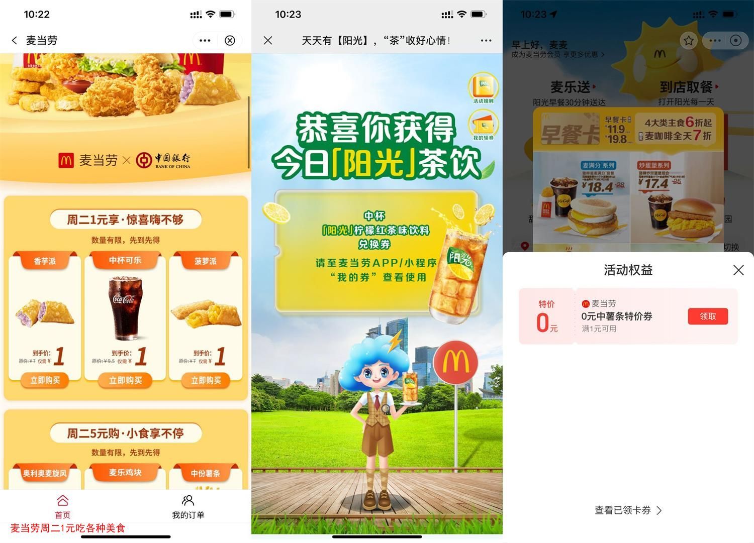 1、中国银行APP搜索“麦当劳”1元买菠萝派/香芋派/中杯可乐