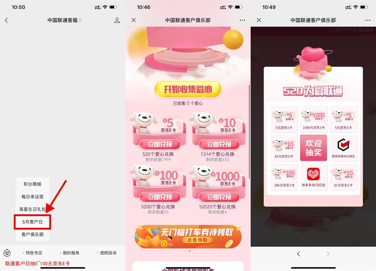 微信关注公众号“中国联通客服”->菜单栏“特色专区-5月客户日”->玩游戏抽京东E卡或累计爱心直接兑换京东E卡