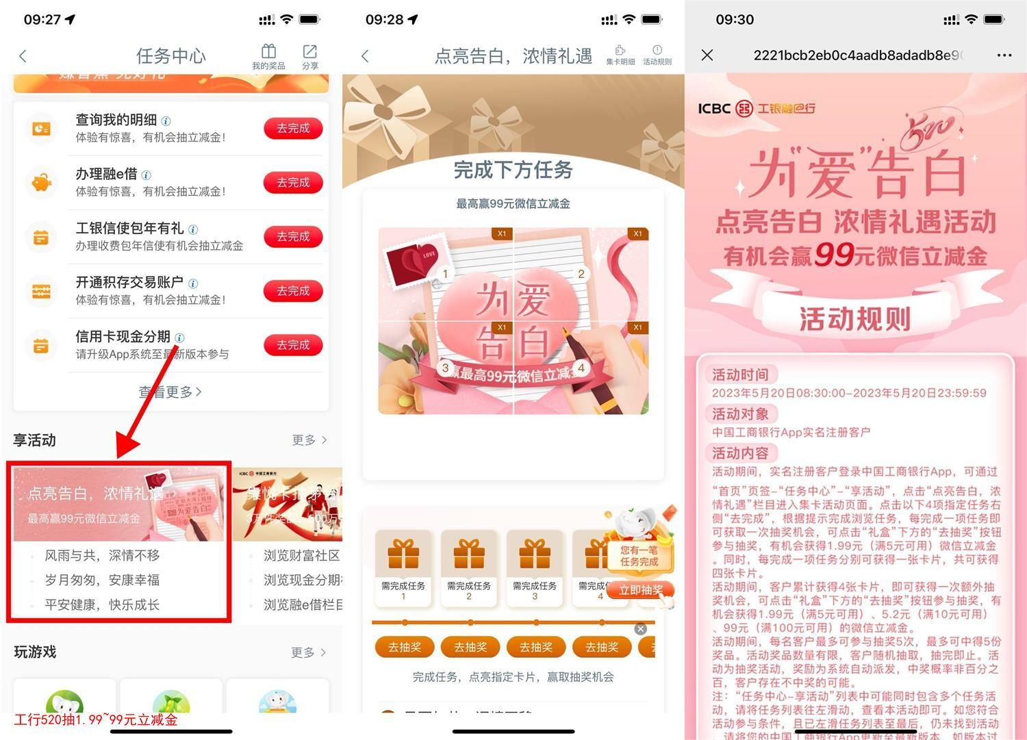 工行APP搜索“任务中心”->点亮告白 浓情礼遇->简单浏览得5次机会抽最高99元微信立减金