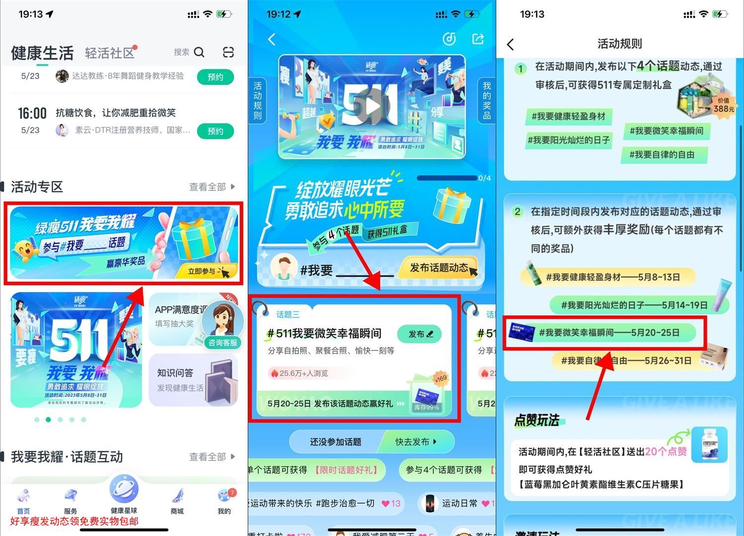 各大应用商店下载“好享瘦”APP->首页下拉“绿瘦511”->发布一个话题动态,审核通过后领“维C软糖”包邮