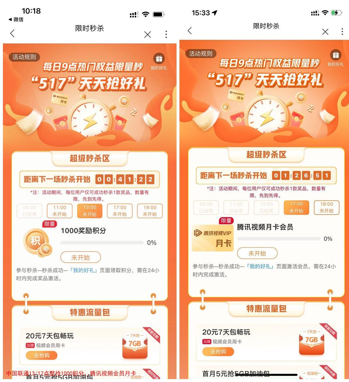 建议大家13点整可以抢1000积分兑换10元话费或17点整抢腾讯视频会员月卡