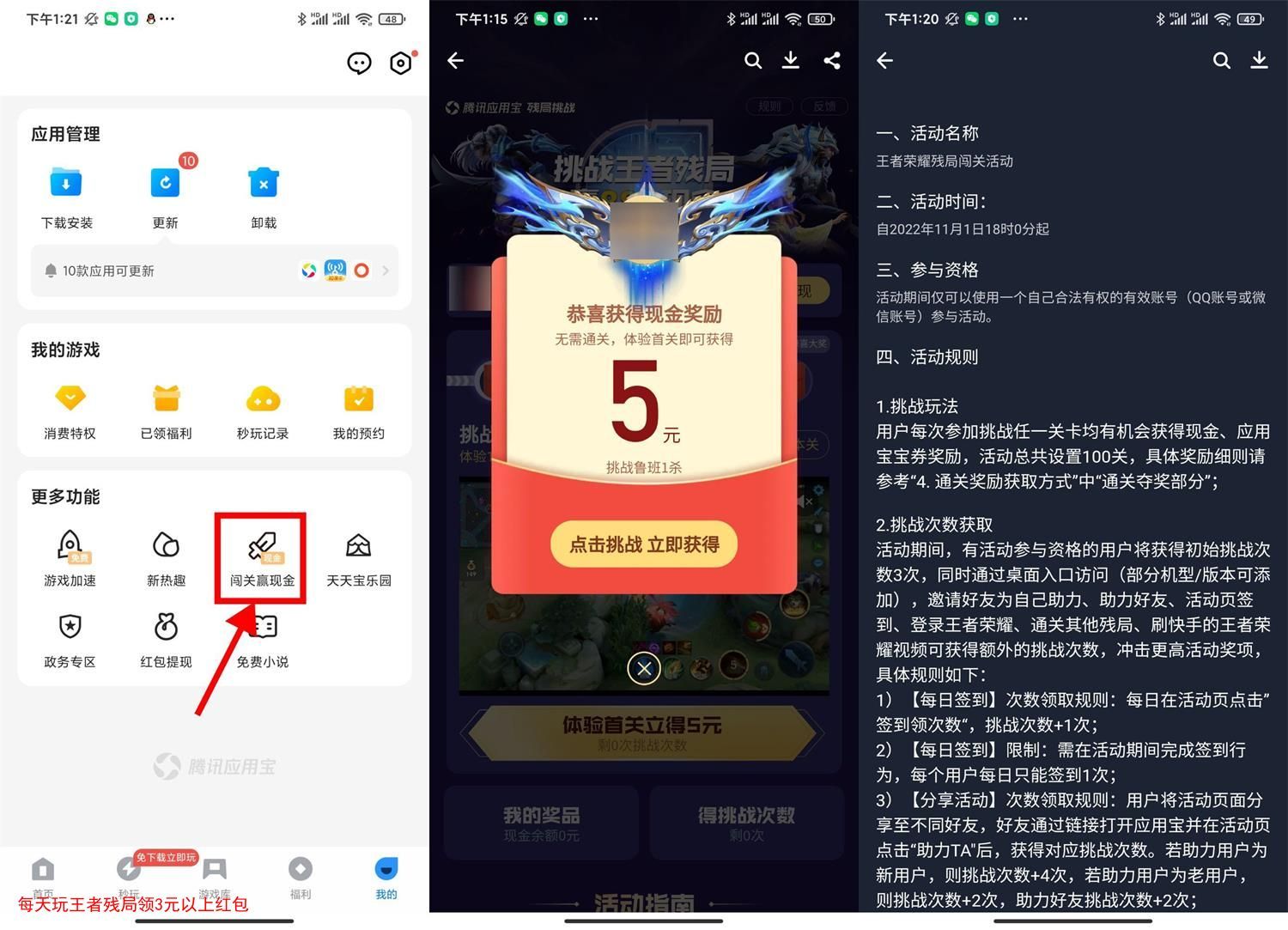 应用宝APP->我的->闯关赢现金->每天简单玩下王者残局领随机红包,累计3元以上即可领取秒到