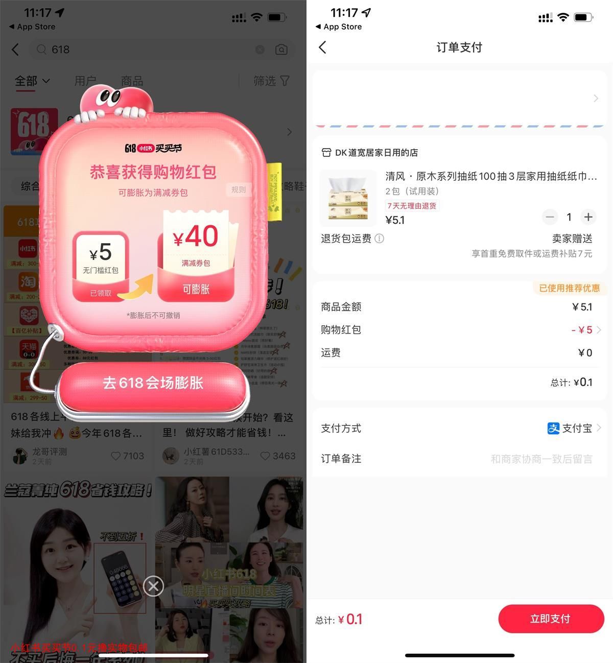 小红书APP最新版->搜索“618”自动弹出5元券(如果不弹就代表无法参与)->搜索自己想要的实物下单立减5元