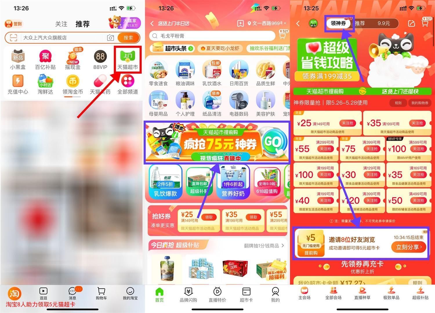 淘宝首页“天猫超市”->点击横幅进入->顶部“领神券”下拉邀请8人助力领5元天猫超市卡