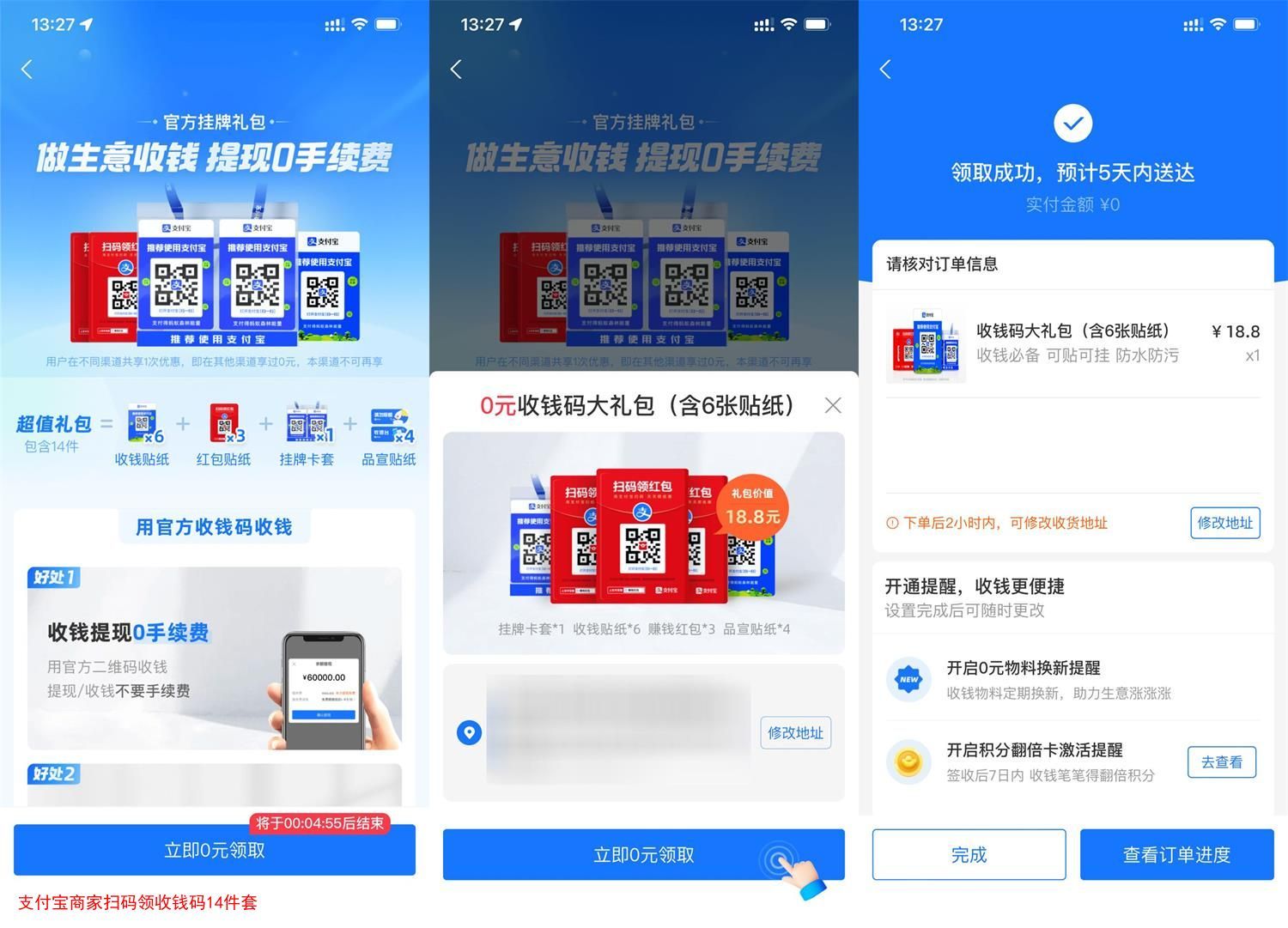 支付宝扫码->显示“立即0元领取”就代表可以参与,选择地址直接领取 免费包邮到家