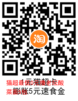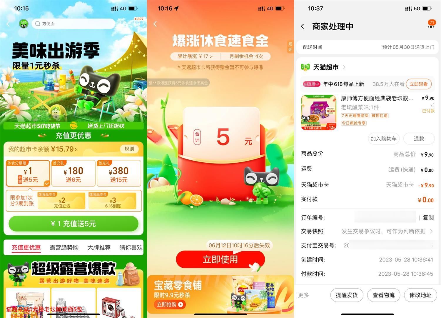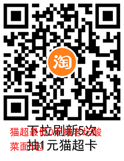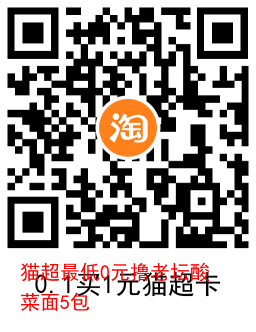 淘宝扫码0.1买1元猫超卡->接着扫第二张码刷新抽1元猫超卡->翻牌抽1元猫超卡->充1送5元速食金->1元膨胀5速食金->老坛酸菜面5包