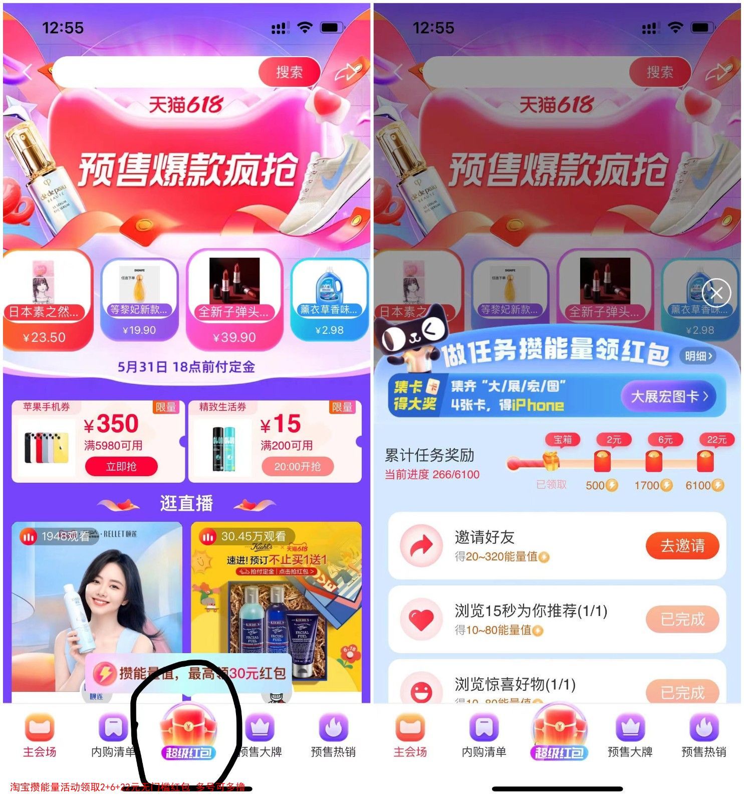 这个活动是淘宝天猫双618的另外一个活动,这是攒能量的活动,通过打开淘宝APP进去活动里,每天完成页面指定的任务可以获得能量,累积达到500、1700、6100能量可以分别领取到2元、6元、22元淘宝无门槛红包,得到的红包可以跟所有618红包累积在全淘宝、天猫购买实物商品无门槛抵扣,最低也可以0元撸实物。