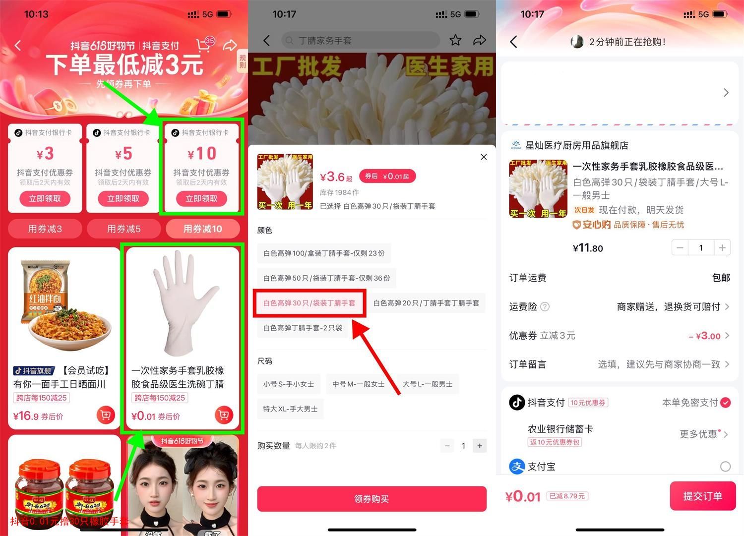抖音APP扫码->直接领10元券->下拉找到橡胶手套进入,数量选择30只,尺寸任意,页面显示0.01元就付即可