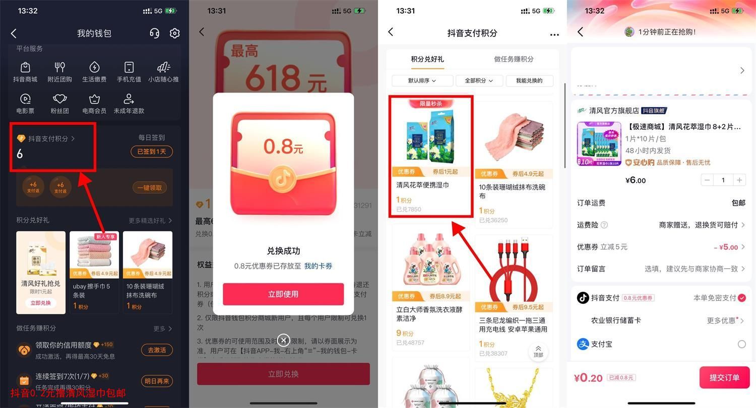抖音APP->我的->右上角“三”->我的钱包->下拉领积分,然后进入使用1积分兑换0.8元支付券,再使用1积分兑换清风湿巾券,湿巾0.2元包邮到手