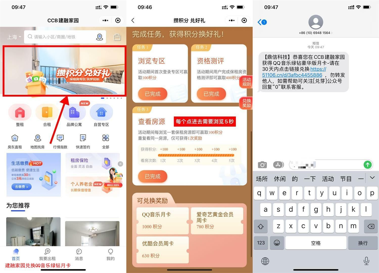 微信进入小程序“CCB建融家园”->左上角改成“上海”->点击攒积分横幅进入->简单浏览和答卷得1000积分,可兑换绿钻月卡、爱奇艺/优酷周卡