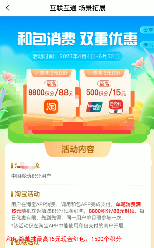 2、支付成功后会立返最高88元现金红包、或者8800个积分,支付后就会收到一条短信会提示中到多少奖励
