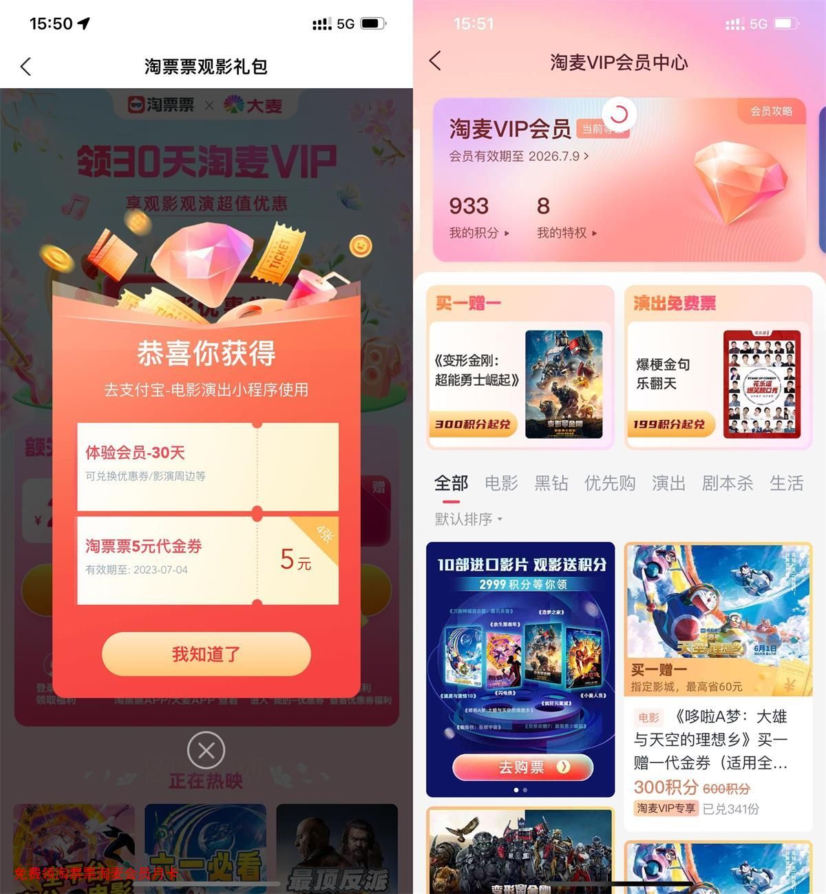 支付宝APP扫码->直接领取30天淘票票会员