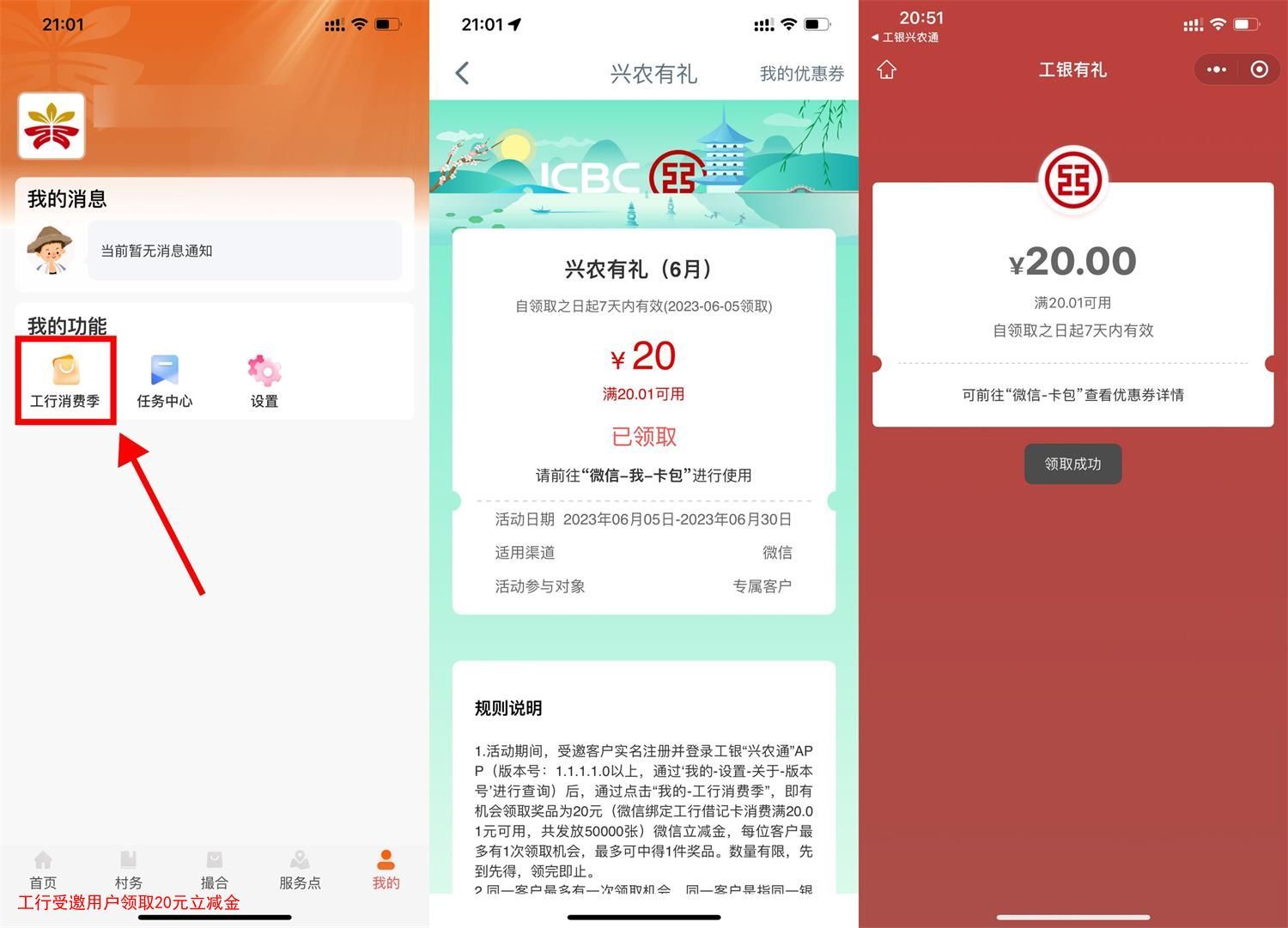 工银兴农通APP搜索“工行消费季”->受邀用户直接领取20元微信立减金,工行用户都去看看有没有!