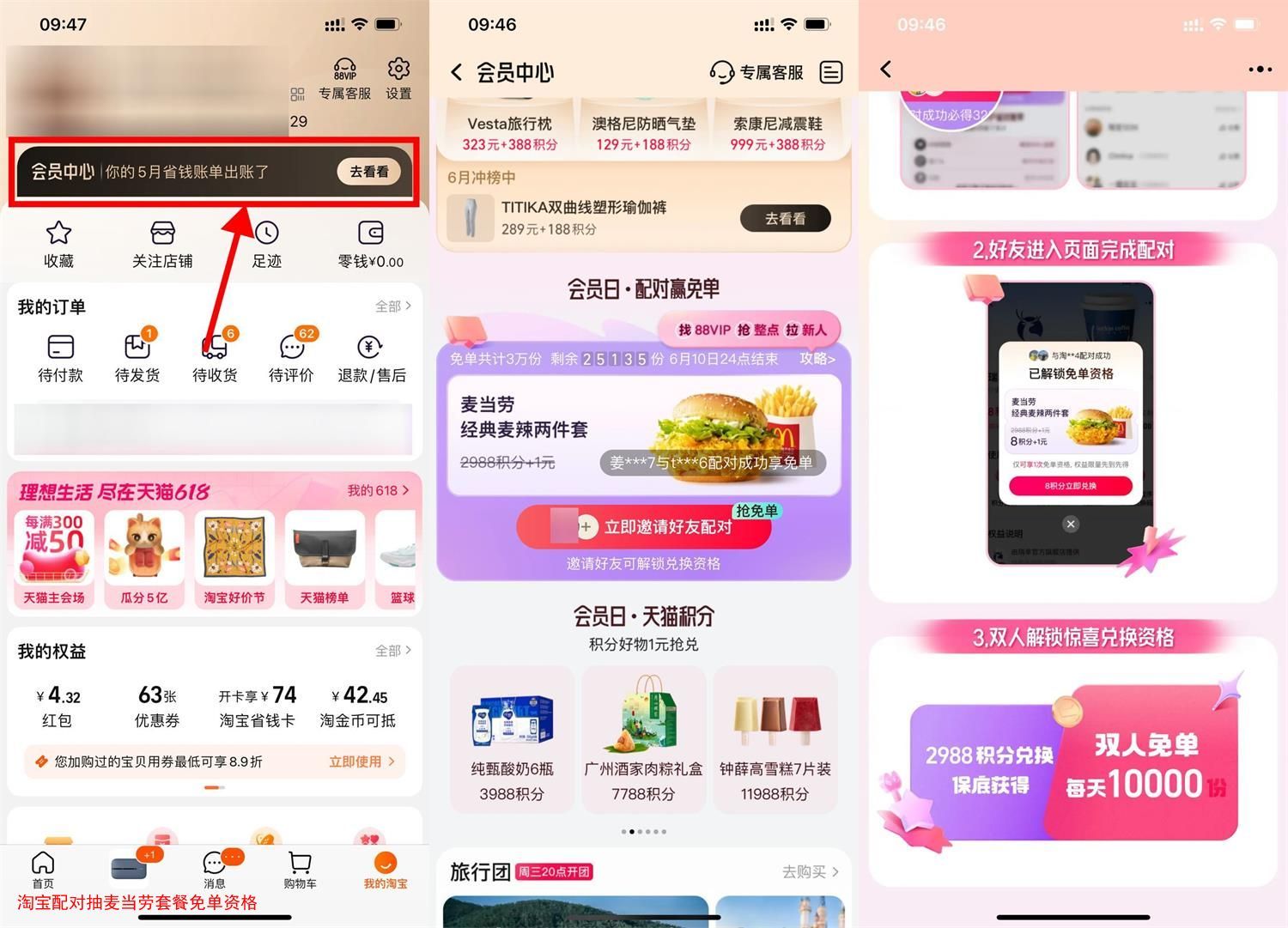 淘宝APP搜索“会员中心”->邀请1名好友配对抽免单,如果抽中免单则2人都免单,使用8积分+0.01元兑换麦当劳套餐。没抽中免单则可以用2988积分+0.01元兑换