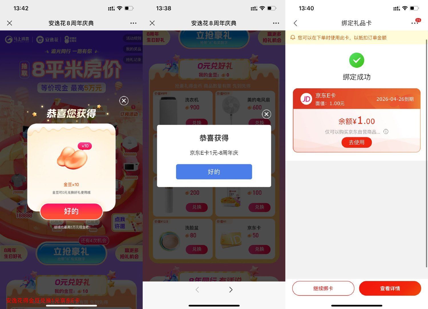 2、下拉使用50金豆兑换1元京东E卡->在右上角“我的奖品”中领取兑换