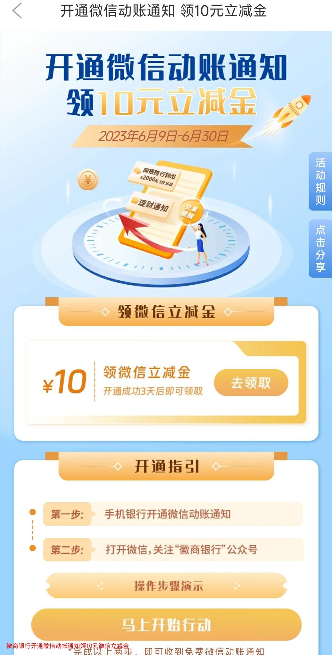 徽商银行持卡人(含电子),可在活动期间登录徽商银行App主页活动横幅中进入活动,按照要求完成微信动帐通知开通。开通成功后即可领取10元微信立减金奖励。每个客户活动期间仅限参与一次,活动奖励限量8万份,数量有限,领完为止。