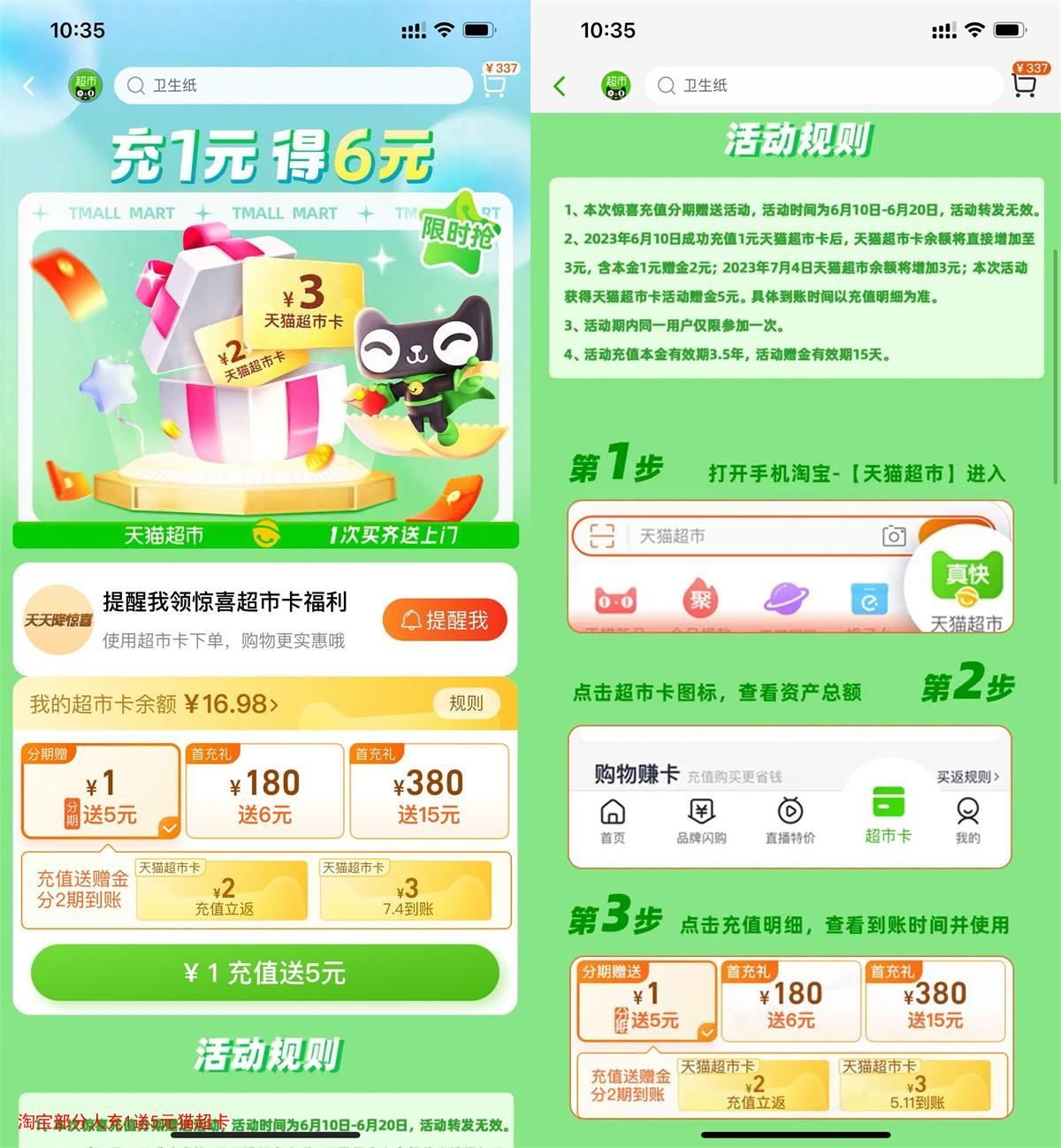 淘宝APP扫码->页面有提示充1送5元就直接充,秒到3元猫超卡,7月4日再送3元猫超卡