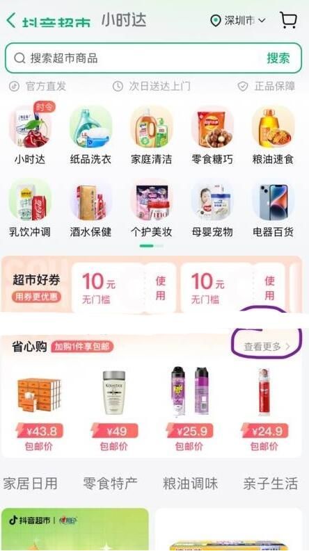 打开抖音APP搜索【抖音超市】点首页省心购位置–查看更多,大部分是包邮的