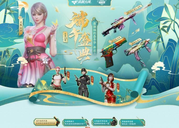 CF怒放端午盛典活动,参与部分奖励:柯尔特-涂鸦、灵狐者-黄金海岸、斯泰尔-墨兰、水晶M4A1-A、Scar Light-白虎、Colt1911-宇航兔兔、皇龙戒、源·裁决、源·麒麟刺、一起过夏天名片&喷图、曼陀罗背包、青霞仙子、麻雀、闪光弹-11周年、Desert Eagle-A等