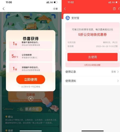 【支付宝领取2张5折公交地铁券】支付宝APP扫码->下拉直接领取券包,包含5这公交地铁券2张,券有效期7天