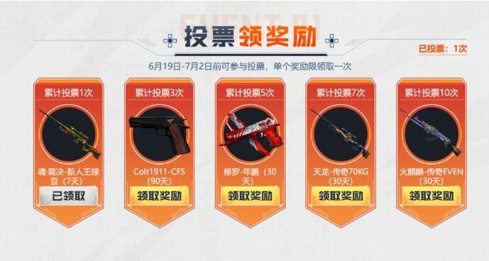 CFPL全明星周末投票活动,每天游戏一局即可获得一次投票机会,累计投票3次领Colt1911-CFS(90天)、累计投票7次领天龙-传奇70KG皮肤(30天)、累计投票10次领火麒麟-传奇EVEN皮肤(30天)