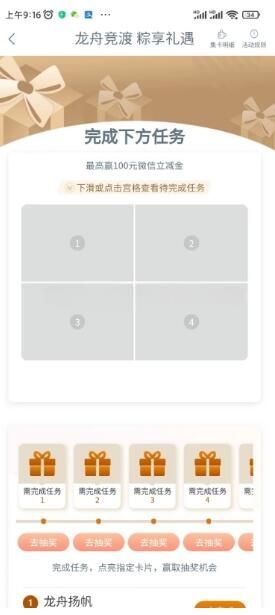 工行龙舟竞渡5个抽2-100元微信立减金,完成4个任务可以抽5次,和平常一样的简单任务,都可以去参与下。