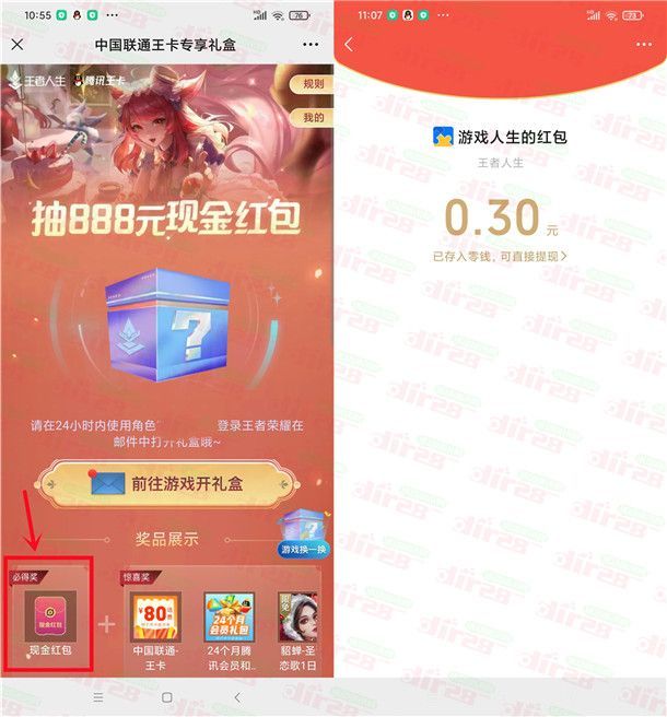 王者荣耀手游开礼盒部分用户领取0.3-88元现金红包 亲测秒推