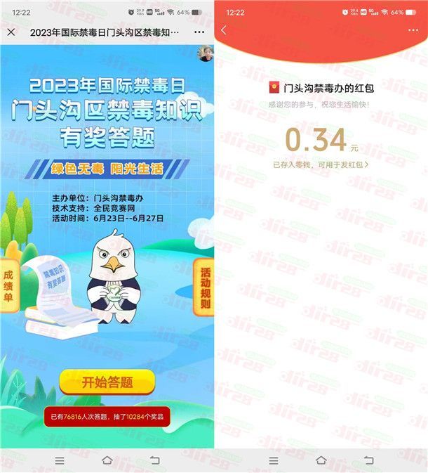 门头沟禁毒知识微信答题抽随机微信红包 亲测中0.34元秒推