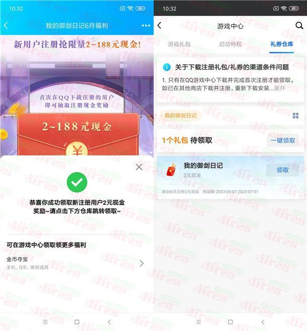 腾讯我的御剑日记手游活动又来了,通过打开手机QQ进去活动里下载我的御剑日记app手游客户端,首次用QQ号码注册登录就可以回到活动里领取到2-188元现金红包,前段时间领了预约红包的还可以去手机QQ礼券仓库里额外领到2元现金红包,数量限量。