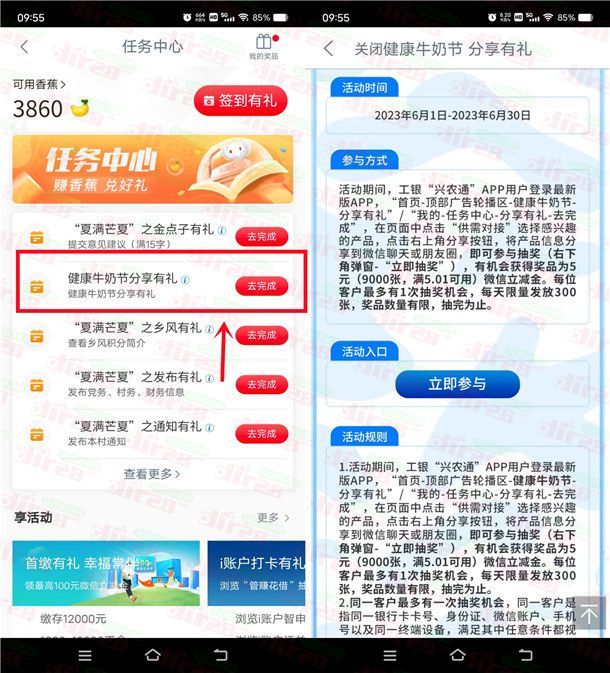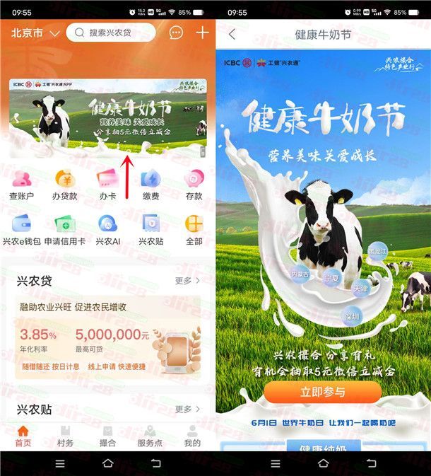 小编提示:打开兴农通APP,首页点顶部滚动图【健康牛奶节】进去,按照提示进去任务中心页面,完成【健康牛奶节分享有礼】的任务(在首页随便点开一个进去点右上角分享就行),非必中