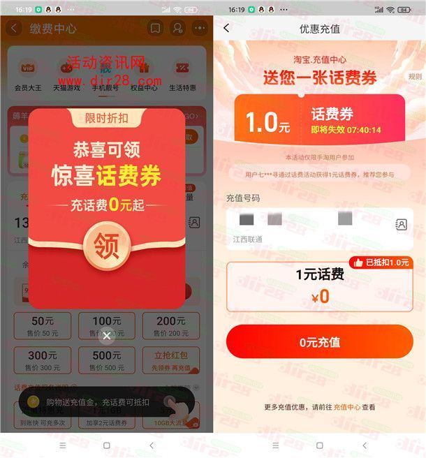 新的淘宝0撸手机话费的活动,之前参加过类似活动的也可以去看看,通过打开淘宝APP在首页点【充值中心】进去,进去点击弹窗可以领到1元话费券,可以0元充值电信或者联通手机话费抵扣,充值的手机话费目前秒到账,只有部分用户才可以领到这个1元无门槛话费券。