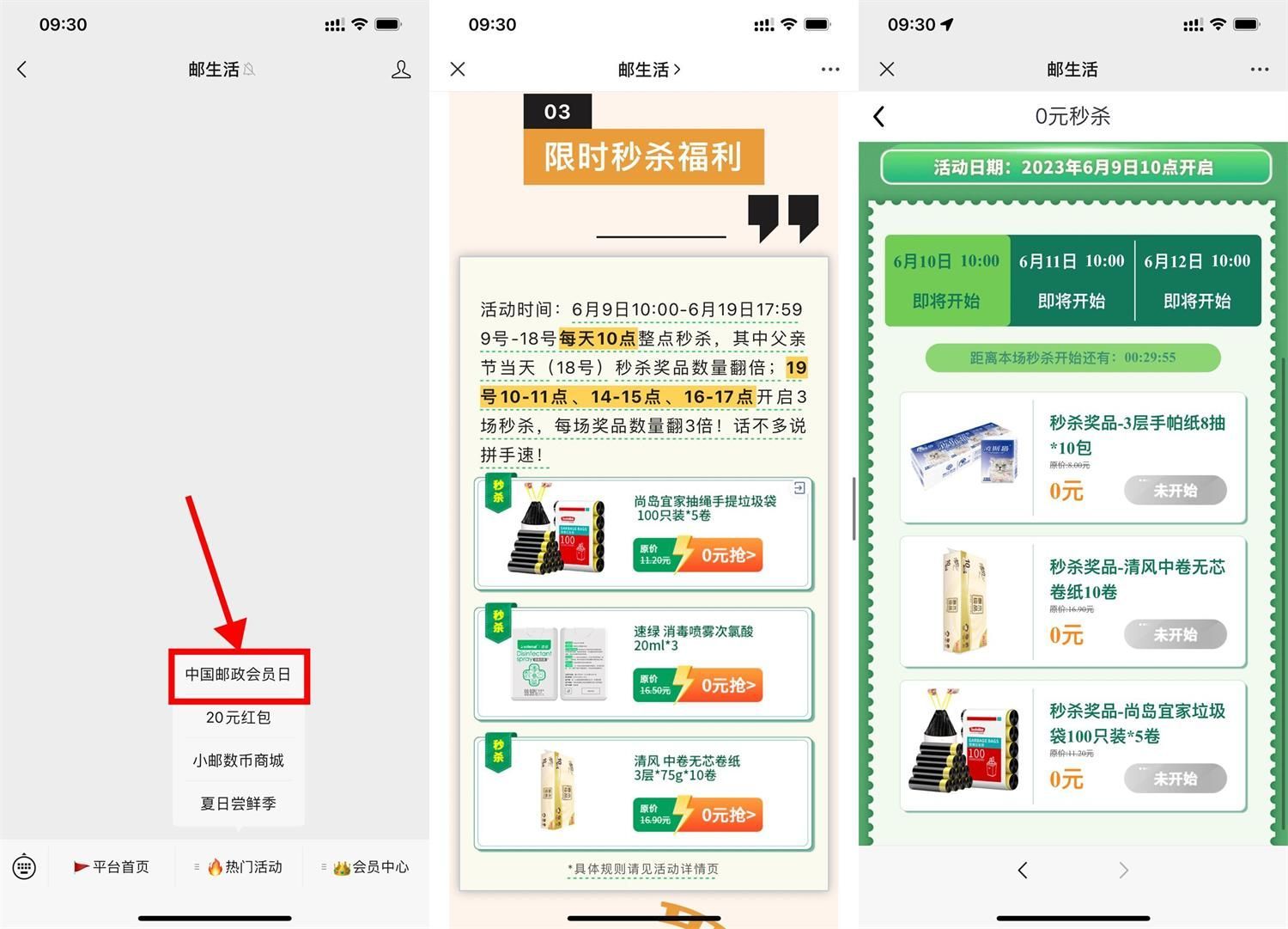 微信关注公众号“邮生活”->菜单栏“热门活动-邮政会员日”->今天10点、14点、16点准点抢实物,自己设置一个闹钟,大概30秒内抢完