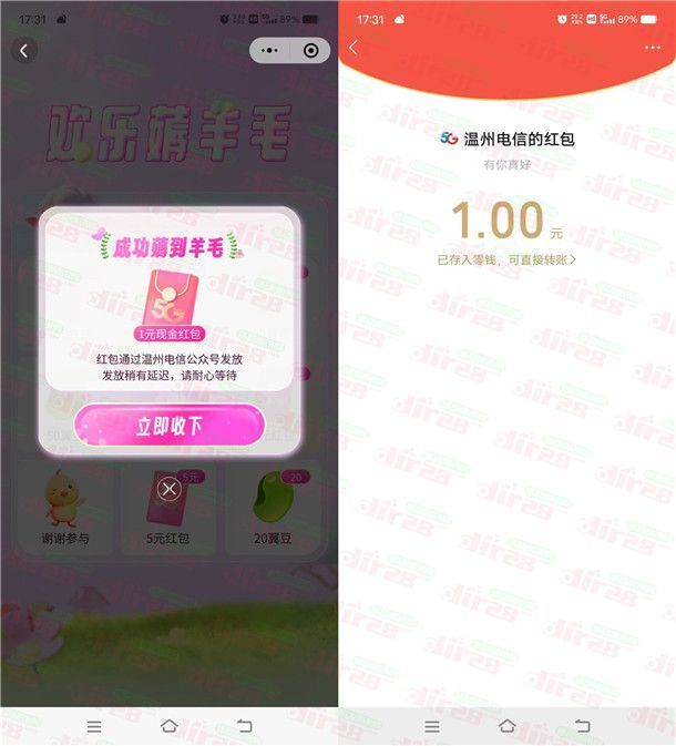 温州电信和华夏基金的2个简单的活动,写在一起便于大家一起参加,通过打开微信进去活动里,温州电信的活动每天3次游戏机会,只要在小游戏中累积薅到88团羊毛就可以抽奖1次,华夏基金的活动小游戏达到100分可以抽奖,有机会中到随机金额的微信红包,小编测试2个活动中到1+0.3元,非必中。