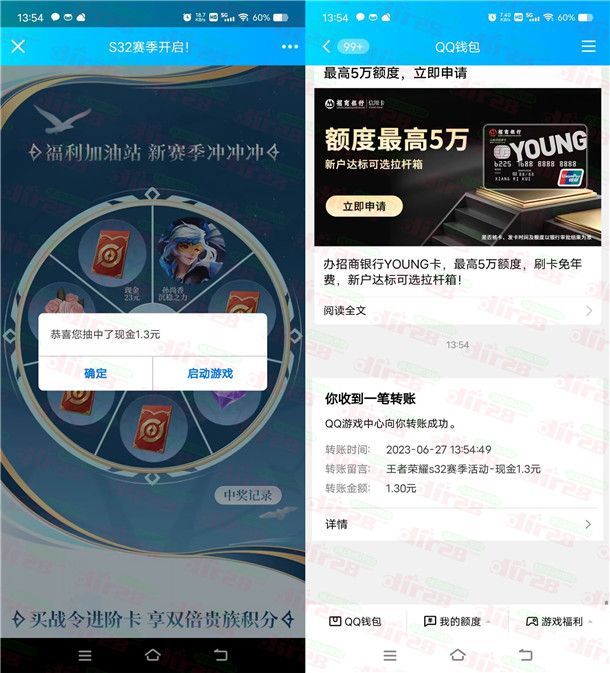 参加王者荣耀举办的S32赛季开启手游登录抽红包活动,这个活动新老用户都可以去,通过打开手机QQ进去活动里,完成页面指定的任务可以领取电池获得抽奖机会,每消耗1个电池可以抽奖1次,有机会中到1.3-23元现金红包,小编测试中到1.3元秒到QQ钱包余额里,非必中。