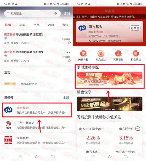 小编提示:打开中国工商银行APP搜索【南方基金】进去场景号里,点滚动图【盈利乐享】进去点图领取6888元体验金,2天收益可以选择自动提现到银行卡,工行体验金的活动需要有工行一类卡才可以参加