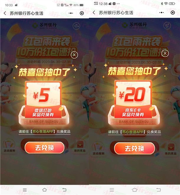 苏州银行苏心生活红包雨瓜分10万微信红包、京东卡 亲测中25元