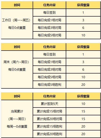 完成每日对局及胜场,即可积累相应的活动积分——“蜜露”。
