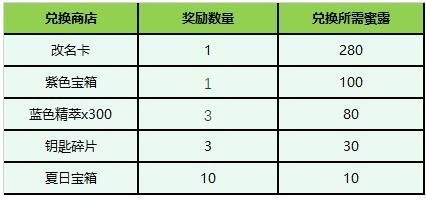 每种奖励对应了不同的蜜露数量,兑换即可解锁相应的奖励~活动结束后,多余的蜜露将以1:1的数量兑换成蓝色精萃,自动发放至玩家的背包。