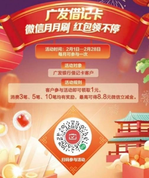 微信刷广发借记卡领8.8元微信立减金,打开直接领1元微信立减金,完成支付笔数任务分别领到1元、1元、2元、4.8元微信立减金,能用QQ发5元红包给自己小号,选择用微信支付即可,每天最多计数2笔,小号别领红包,支付的钱第二天会自动退回你的二类卡
