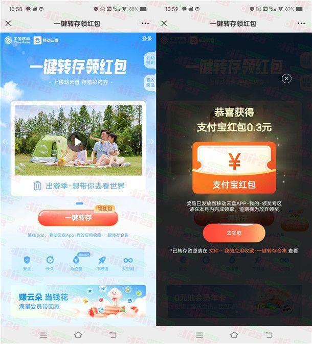 移动云盘一键转存瓜分百万红包 亲测中1元微信立减金秒到