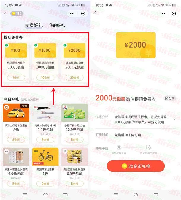 微信支付金币兑换免费提现券!最高可兑换36500亓提现券