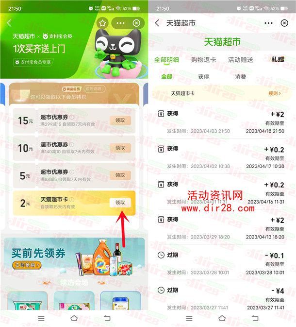 这个活动是支付宝会员等级特权的一个活动,通过打开支付宝APP进去我的会员页面,进去会员特权里面,找到天猫超市的入口进去,就可以直接领取到2-5元天猫超市卡,这个活动需要最低支付宝黄金会员才可以领,领取的天猫超市卡秒到账,可以购买天猫超市商品无门槛叠加抵扣使用。
