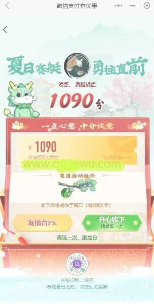 微信支付有优惠夏日赛艇领免费提现额度 最高6888元,按提示玩就行了,金额太小就点【再玩一次】只到满意的提现额度。