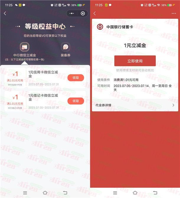 中国银行能量驿站这个活动小编之前也发布过一次,之前发的时候是介绍的步数达标领10元微信立减金,今天还有一个1元微信立减金可以继续去领取,而且比昨天的还更简单,入口都是一样的,通过打开中国银行APP进去活动里并跳转到微信小程序里,在等级权益那里可以直接领取到1元微信立减金,秒到账。