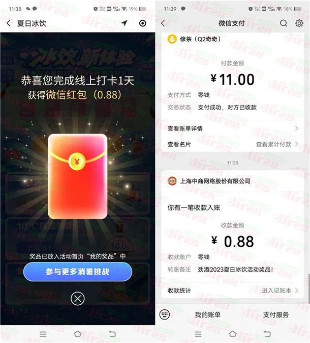 参加劲友家举办的冰饮新体验参与消暑挑战赢999元冰饮好礼活动,通过打开微信进去活动里,完成指定的任务可以获得挑战次数,挑战不同的活动可以抽奖,完成挑战次数也有机会得到32.88元微信红包,去夏日冰饮新体验里完成打卡热舞也有机会中到随机金额的微信红包,小编测试刚中0.88元。