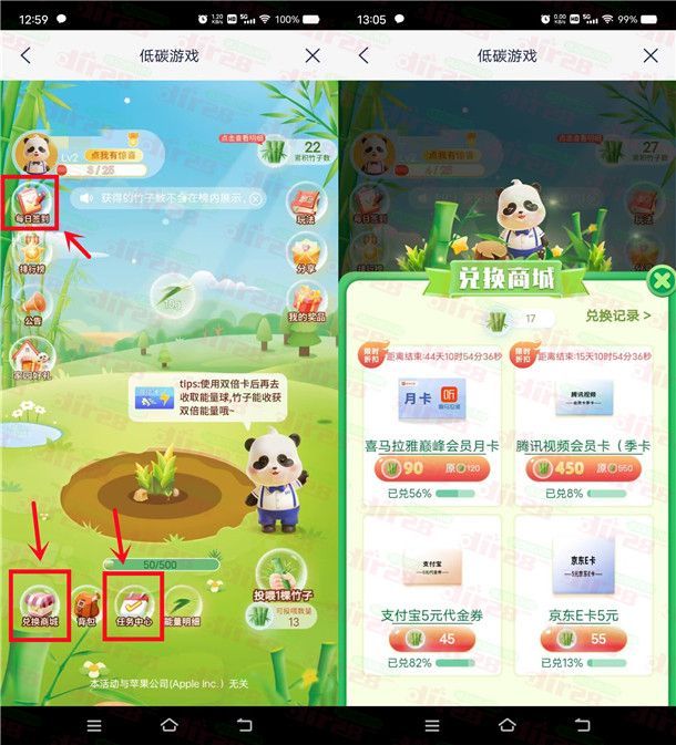 小编提示:打开浦发银行APP搜索【低碳游戏】进去,每天完成签到、和任务中心的任务可以得到能量,收取能量可以升级竹子(每500能量可以让竹子成熟1次),每次竹子成熟可以得到5颗竹子,累积得到45颗竹子可以兑换5元支付宝立减金、或者5元京东卡