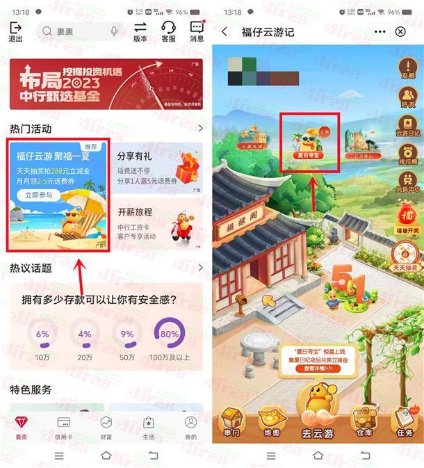 小编提示:打开中国银行APP,首页下拉点【福仔云游】进去,再点【夏日寻宝】进去活动里,每天去云游任务或者抽奖有机会得到夏日限定纪念品,集齐10个不同的纪念品可以在7月20日兑换10元微信立减金,限量1万份