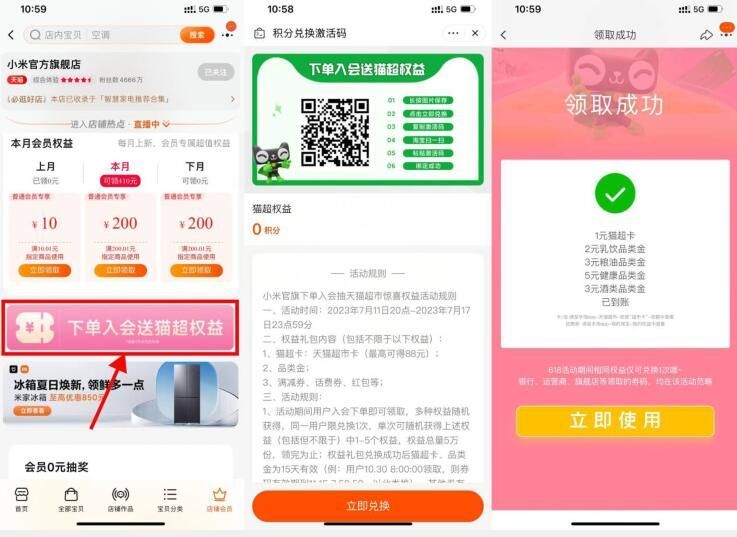 【小米旗舰店入会领1元猫超卡】淘宝APP扫码->入会后点横幅进入->直接领取兑换码->扫页面上的码粘贴兑换即可