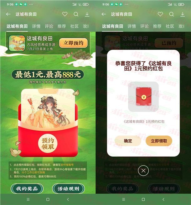 oppo游戏中心预约这城有良田领1-888元现金红包 亲测中1元