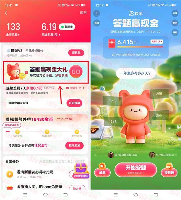 小编提示:打开快手APP,点左上角三条杠再点【任务中心】进去,再点滚动图【答题赢现金大礼】进去活动里,每答对1题均有现金奖励(金额随机),每期积累收益达到36元可以提现,连续答对20题还可以瓜分10万元现金红包